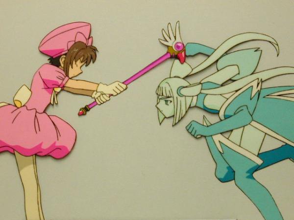 Okay, perhaps it's not that funny for those who take this show seriously, but the poses of the characters on this cel make it funny. I mean, it does look like Sakura is going to conk the Fight card on the head.